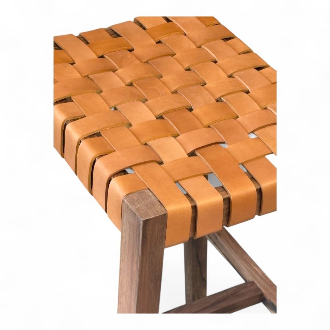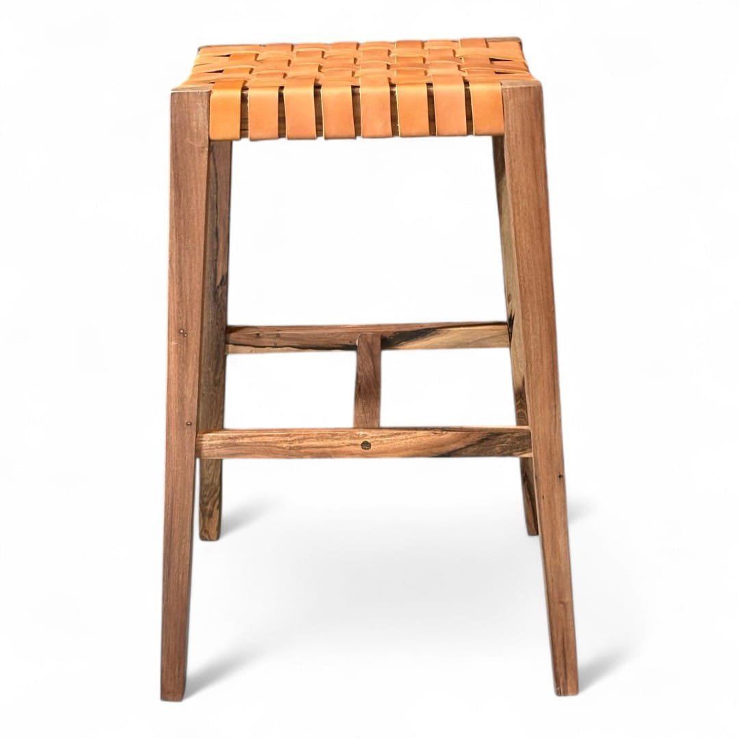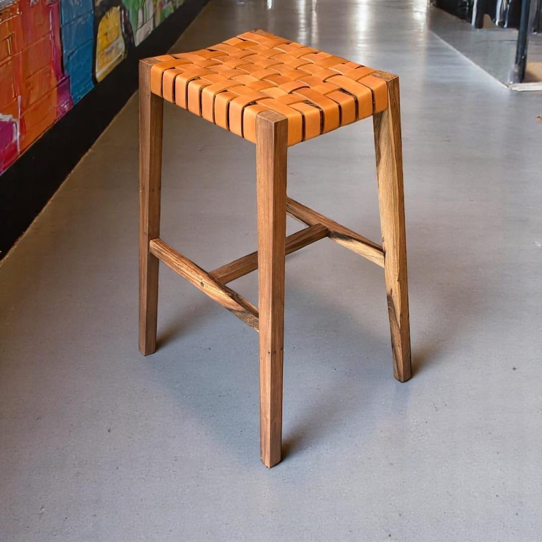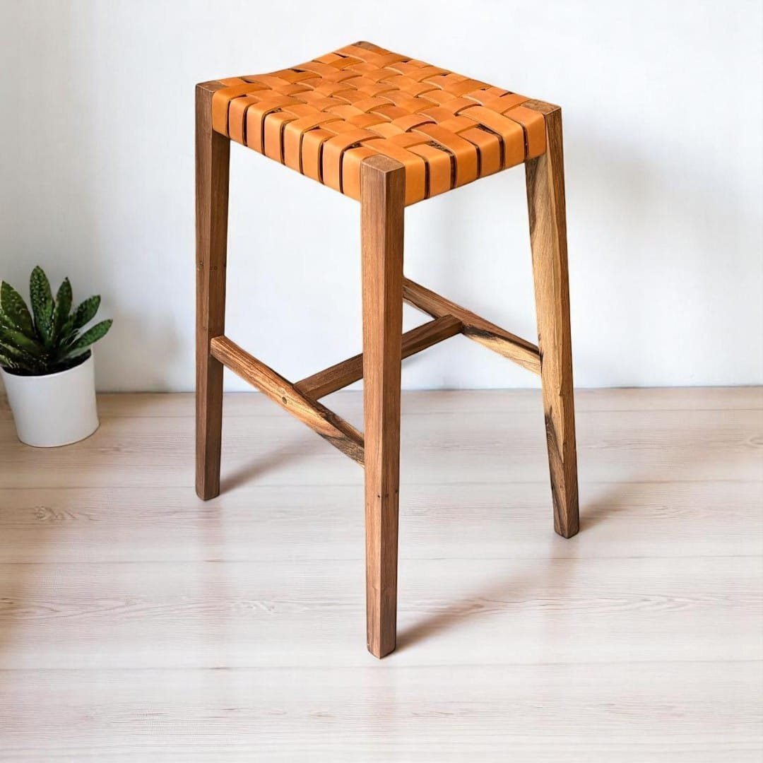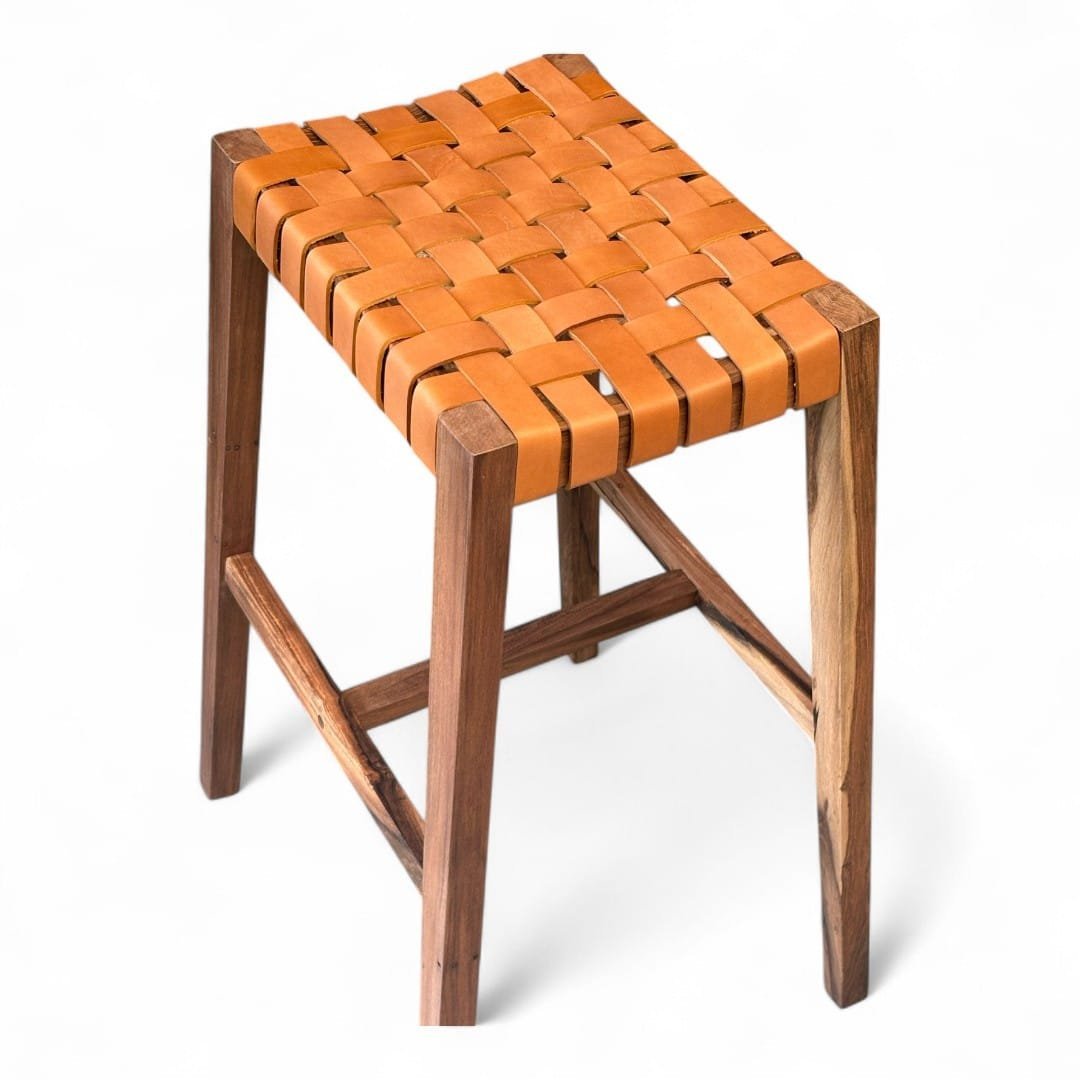 Taburete de madera maciza de Guayubira y asiento Tejido en cuero vacuno o papel Kraft y sin respaldo, ideal para quienes buscan comodidad y estilo en un mueble práctico. Su estructura sólida y asiento tapizado brindan soporte y confort, perfecto para cocinas, bares o espacios modernos. Su diseño minimalista se adapta a cualquier ambiente