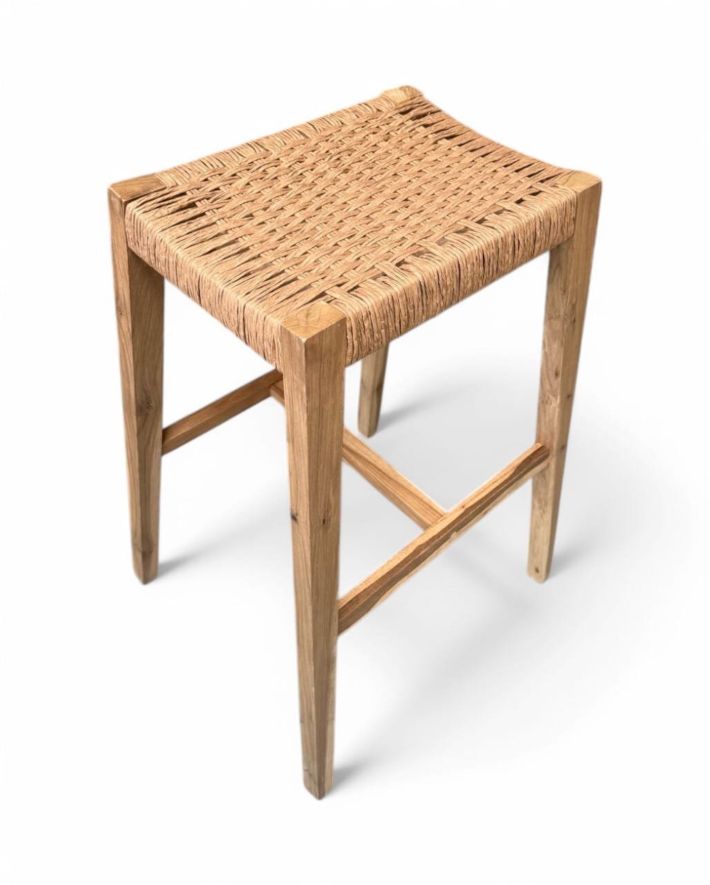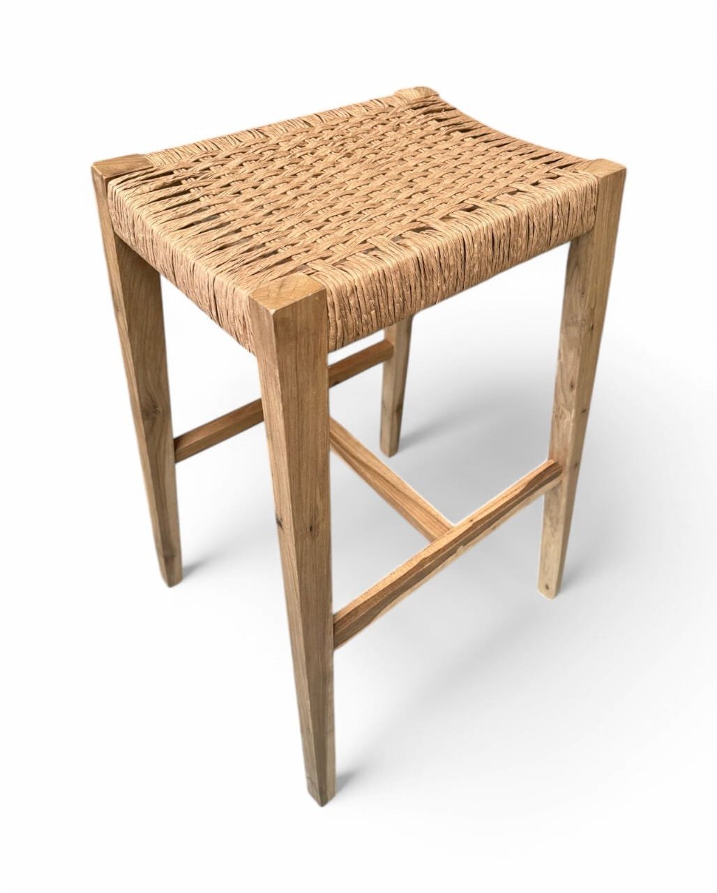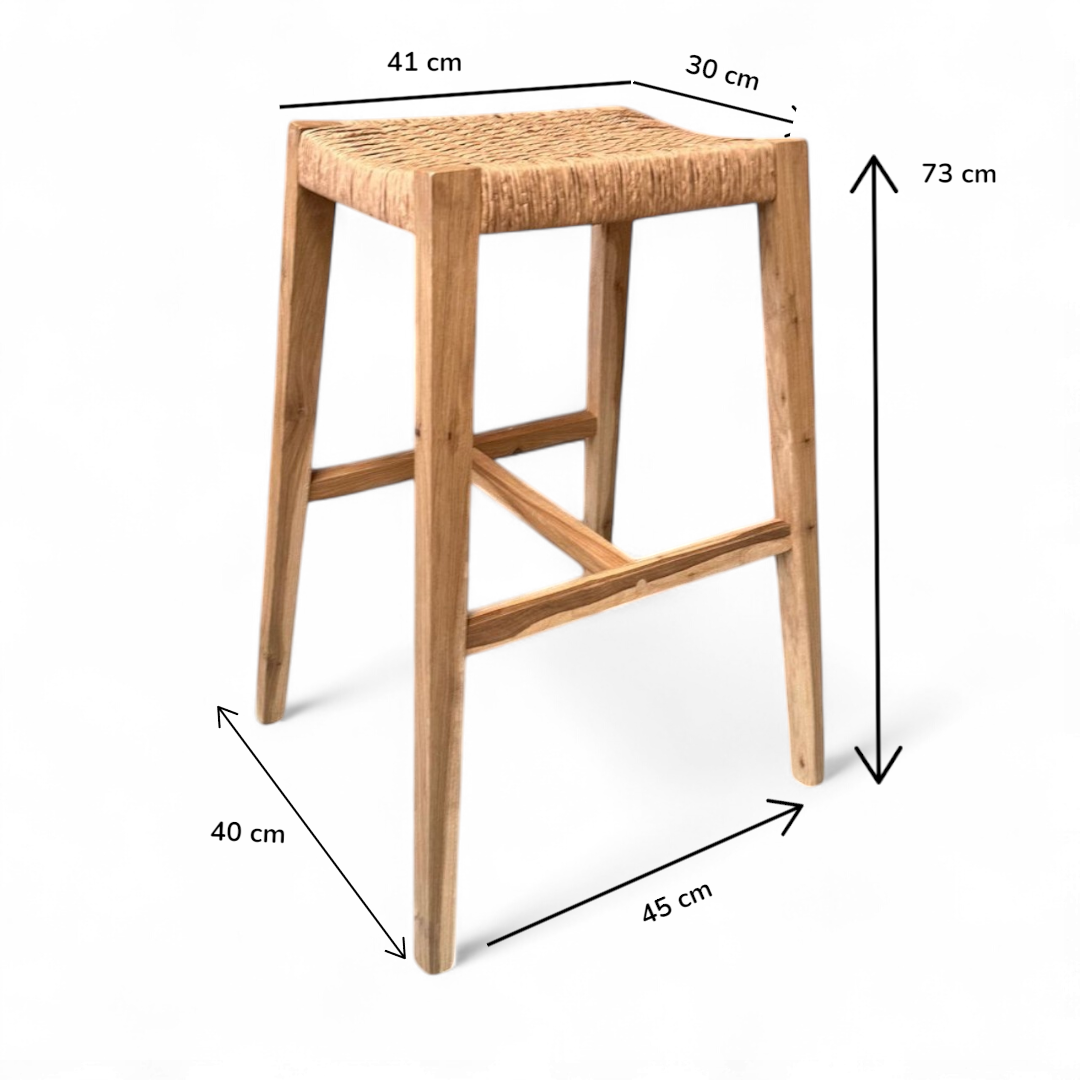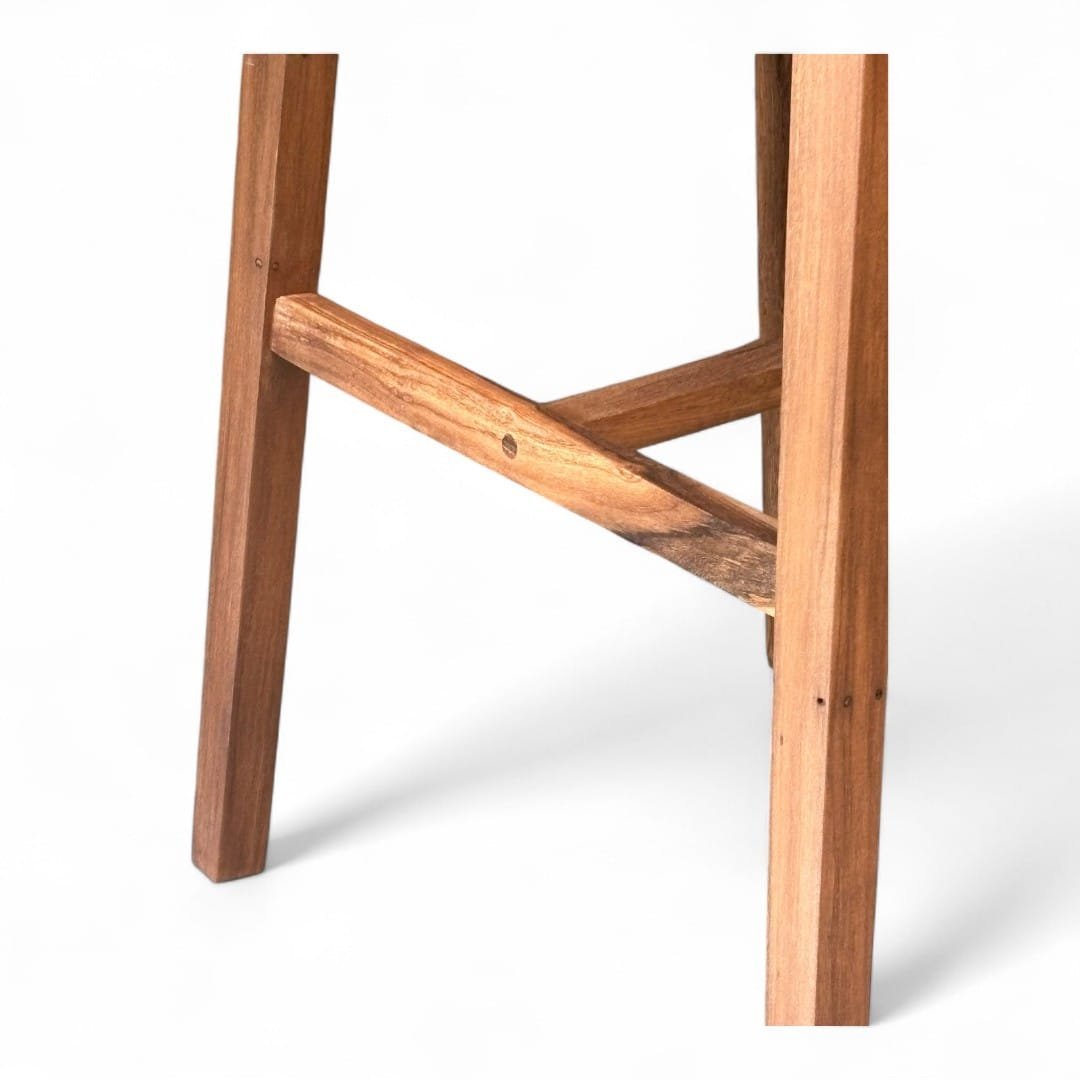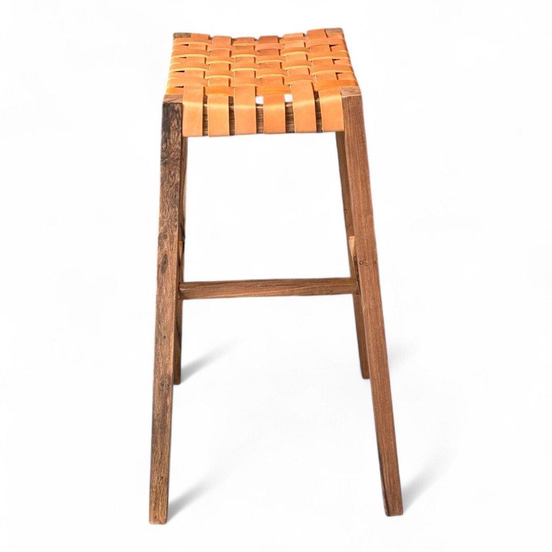 Taburete de madera maciza de Guayubira y asiento Tejido en cuero vacuno o papel Kraft y sin respaldo, ideal para quienes buscan comodidad y estilo en un mueble práctico. Su estructura sólida y asiento tapizado brindan soporte y confort, perfecto para cocinas, bares o espacios modernos. Su diseño minimalista se adapta a cualquier ambiente
