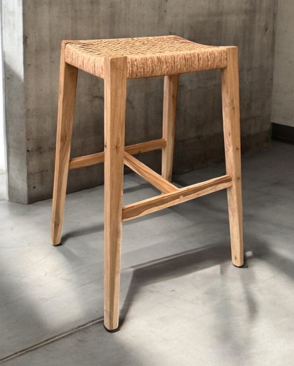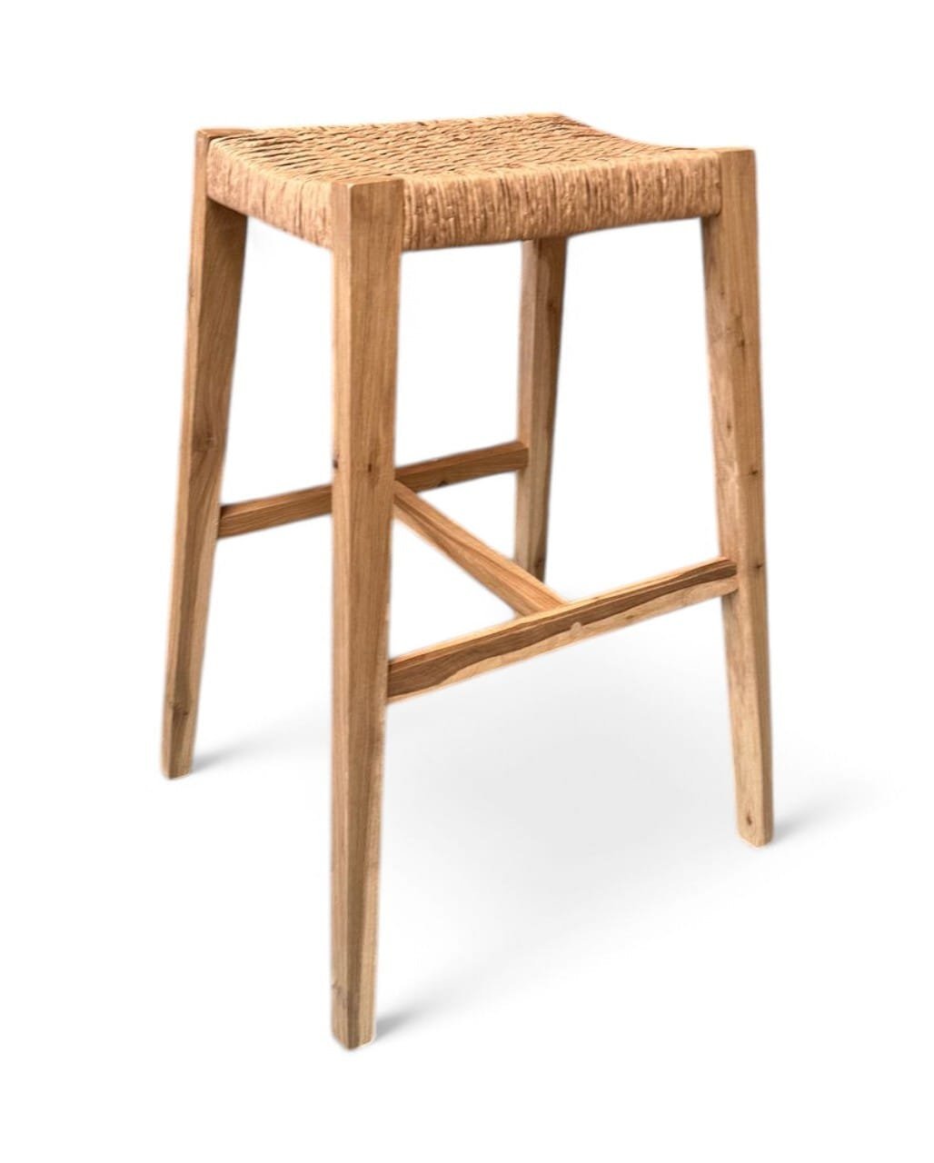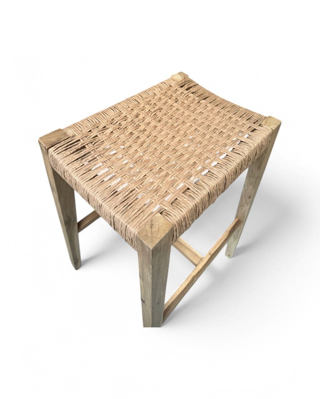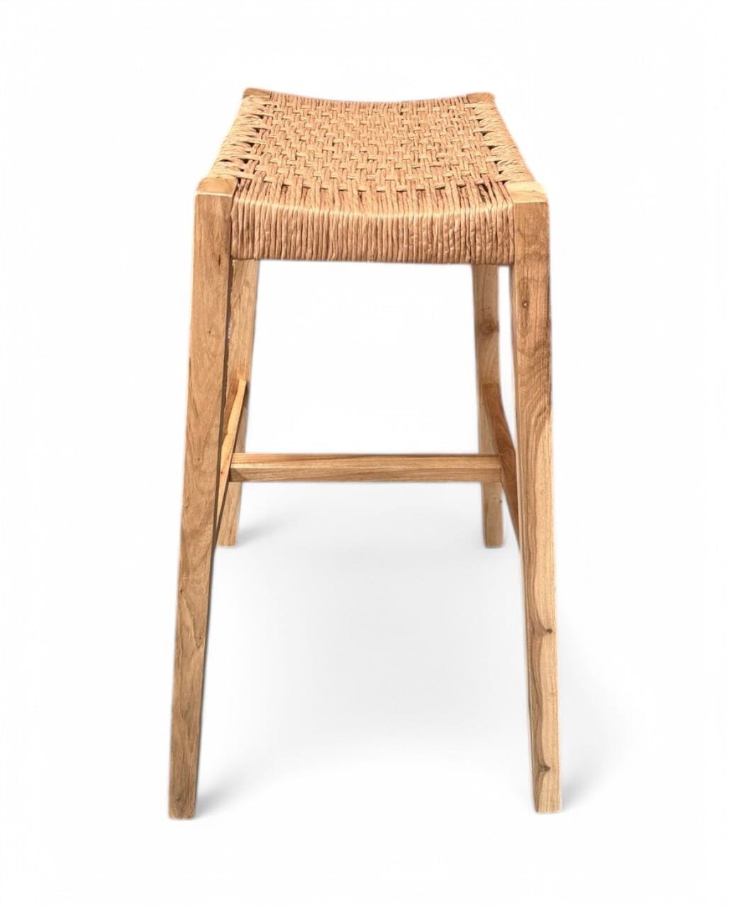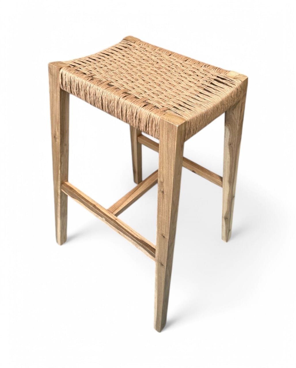 Taburete de madera maciza de Guayubira y asiento Tejido en cuero vacuno o papel Kraft y sin respaldo, ideal para quienes buscan comodidad y estilo en un mueble práctico. Su estructura sólida y asiento tapizado brindan soporte y confort, perfecto para cocinas, bares o espacios modernos. Su diseño minimalista se adapta a cualquier ambiente